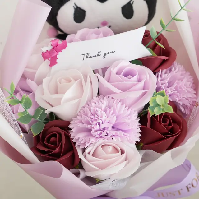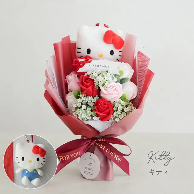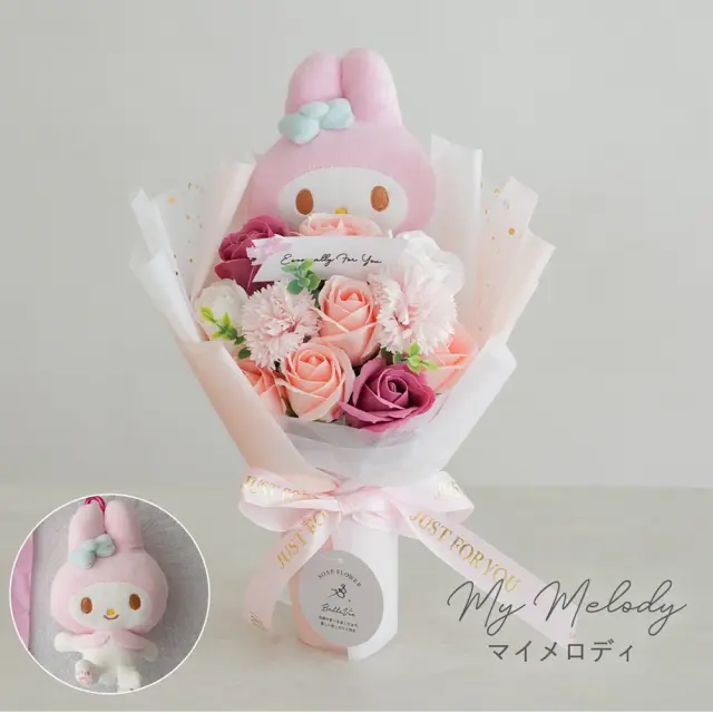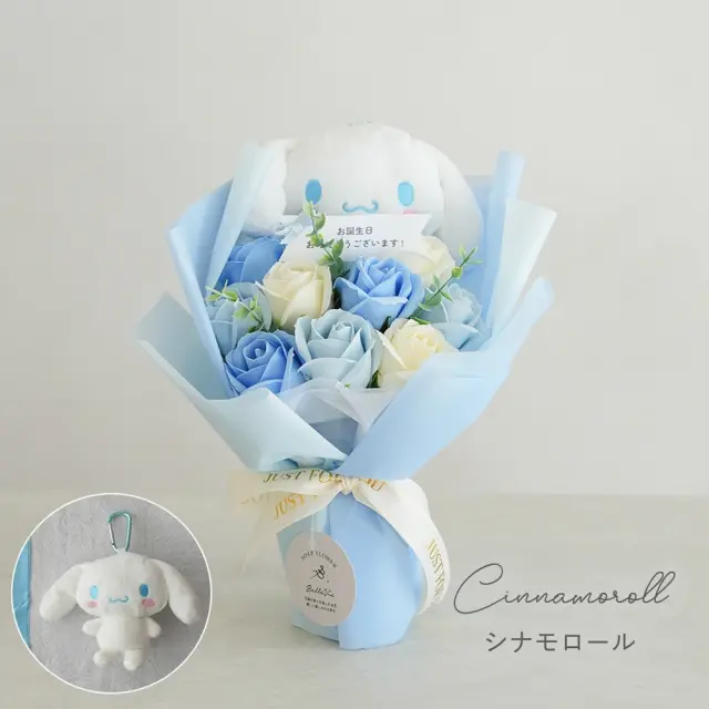 華やかなソープフラワーブーケに、サンリオのぬいぐるみエコバッグを添えて。