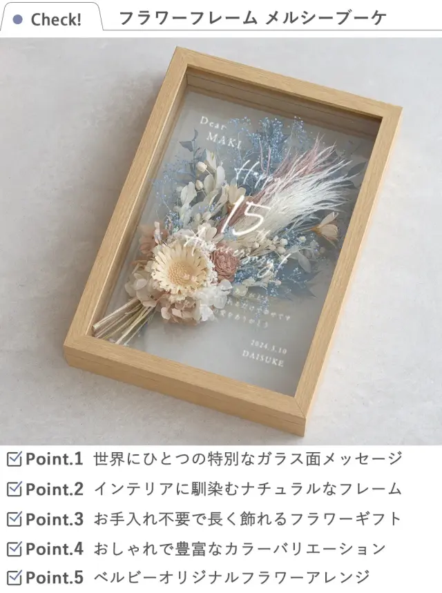 丁寧に連絡をいただきました。 特にデザインにこだわって提案をしてもらえて 細やかな気遣いに感動しました。 ドライフラワーフレームもすごく素敵で喜んでもらえました。 ありがとうございました。 |