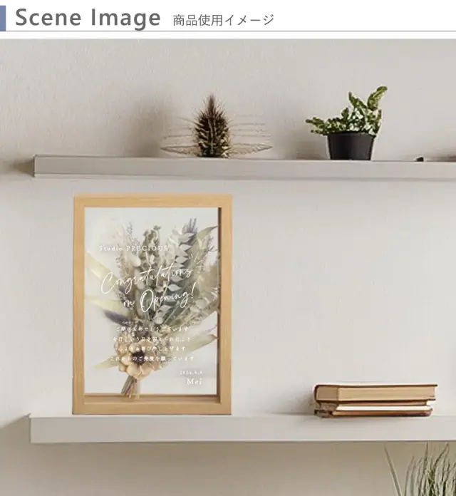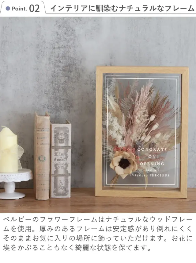 ナチュラルなフレームはどんな雰囲気も馴染みやすく、 お店の開店祝いや周年記念に人気の贈り物です。 - SPEC