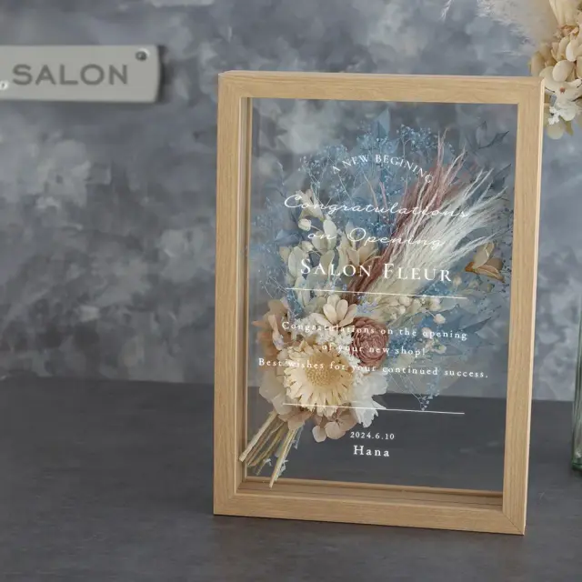 前後ガラスのウッドフレームに、ドライフラワーやプリザーブドフラワーでアレンジした 花束を入れたフラワーギフト。