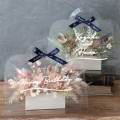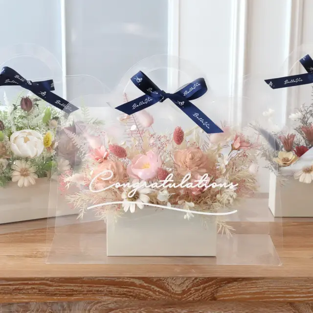 ドライやソラフラワーのアレンジをクリアなバッグにメッセージをプリントして贈る