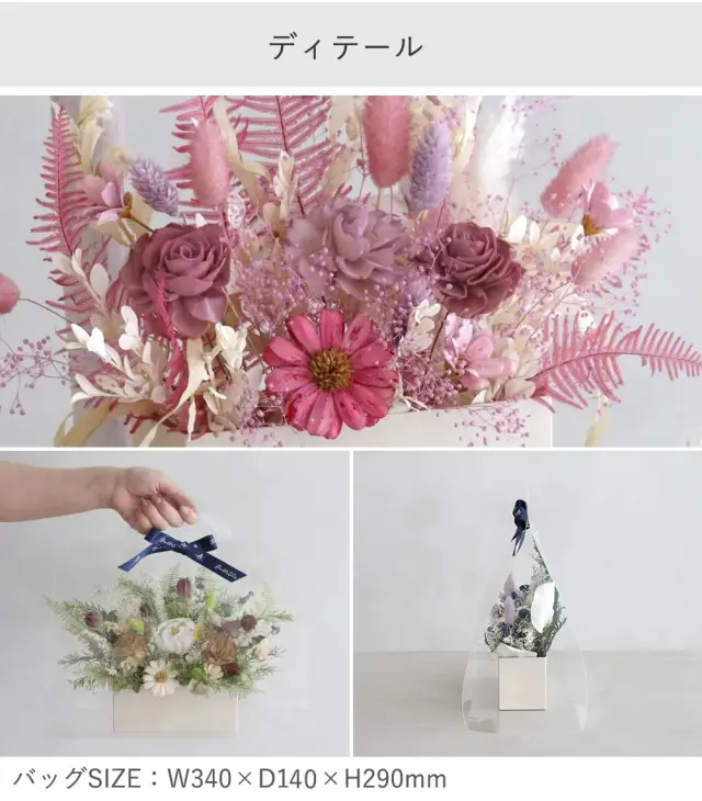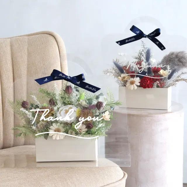『ドライやソラフラワーのアレンジをクリアなバッグにメッセージをプリントして贈る』