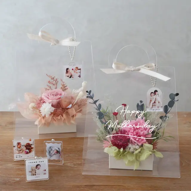 ハイセンスなフラワーギフトと、お気に入りの写真でつくれるキーホルダーのセット。