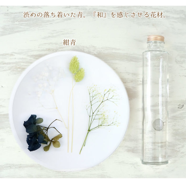 瓶の底で揺れる植物も自然の風合いとして、お楽しみ下さい。