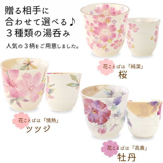 贈る相手に合わせて 華やかな湯呑み「桜」「ツツジ」「牡丹」の3種類からお選びいただけます