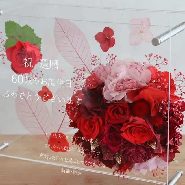 透明感溢れるアクリルと還暦のお祝いにも相応しい気品あふれるレッドの組み合わせが、