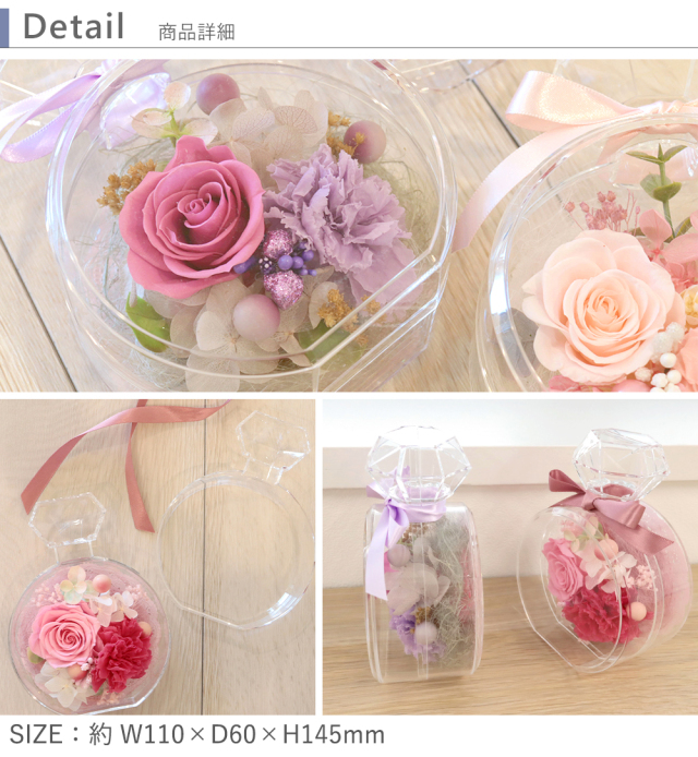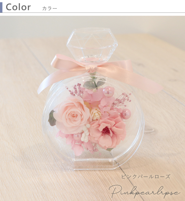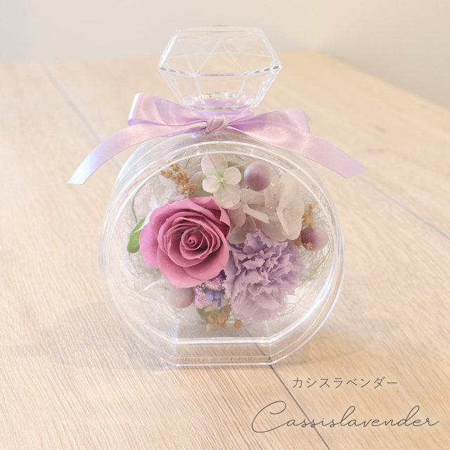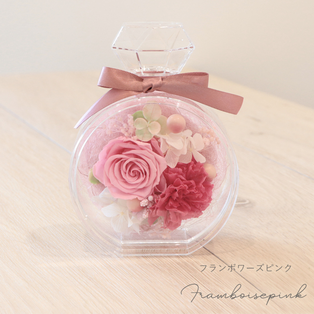丸い香水瓶型のクリアケースに 入ったプリザーブドフラワー
