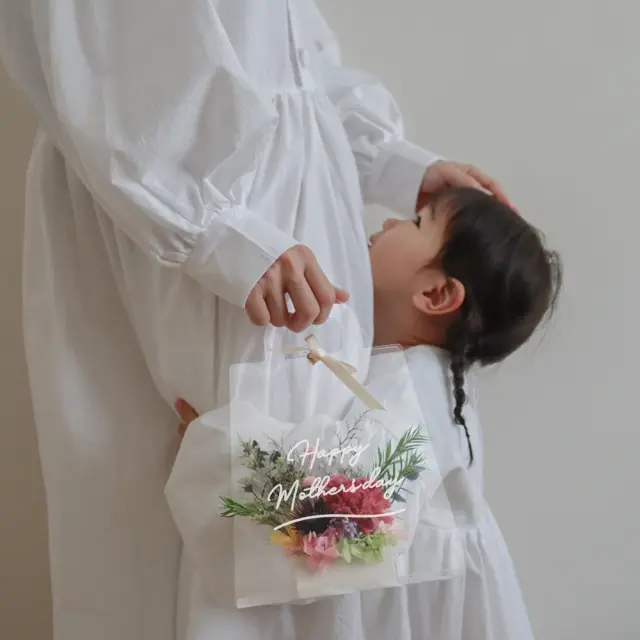 お誕生日・母の日・ありがとう・おめでとうの気持ちを贈る、ナチュラルでおしゃれなフラワートートが新登場。アレンジは全8種の中からお好きなお花をクリアトートに入れてお届けします。バッグ型になっているから渡しやすく、飾っておしゃれなムードに。今時おしゃれなフラワーギフトを贈りたい方におすすめです。 - SPEC