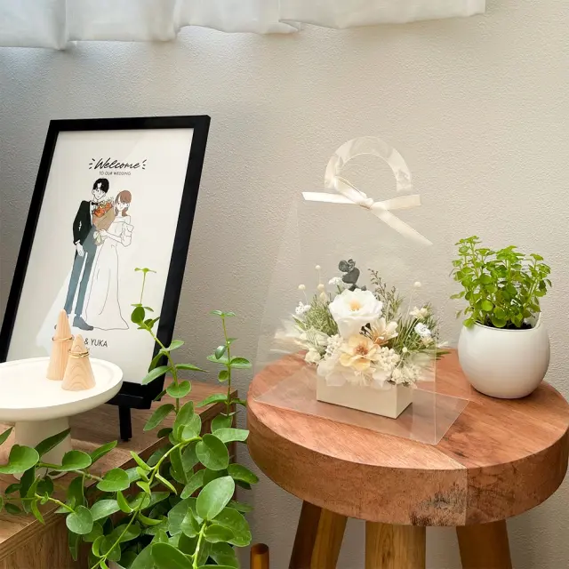 トレンド感のあるクリア素材×ナチュラルフラワーの組み合わせは、おしゃれなあの人にも。