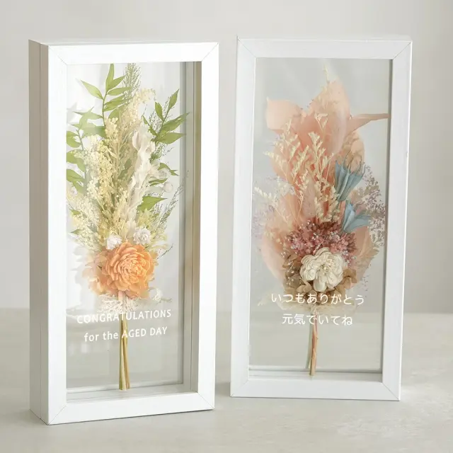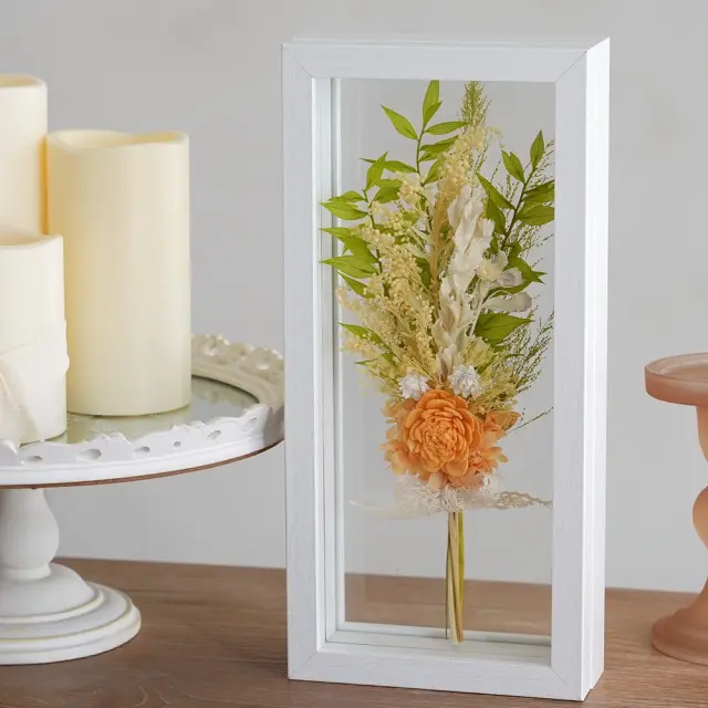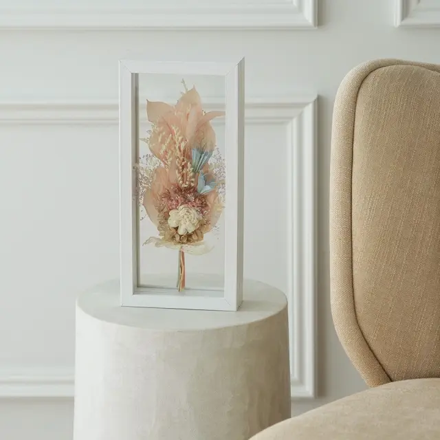 ドライフラワーの小さな花束を、両面ガラスのホワイトフレームにセット。