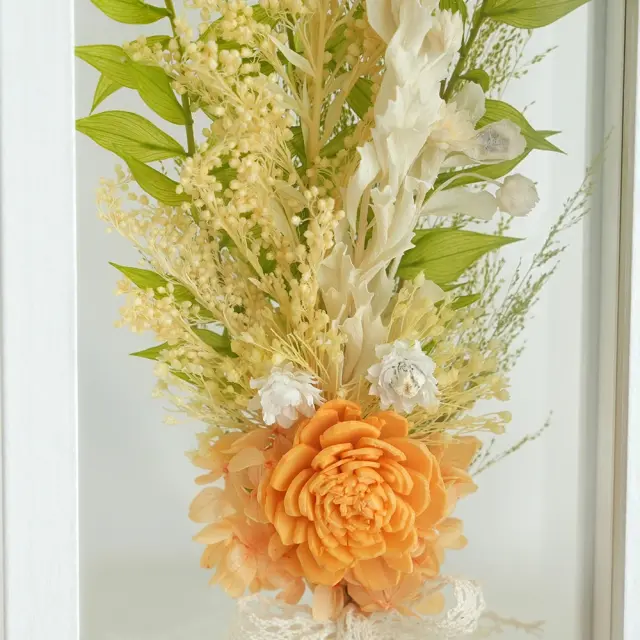 ヘリクリサムヘッド(ドライフラワー)、ラグラス(ドライフラワー)、オレンジスライス(ドライフラワー)、ミニギフトカード、エルビエウッドフレーム ほか