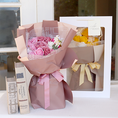 花束を送りたかったのですが枯れてしまうのが寂しいので長持ちするプリザードフラワーを送ろうと考え取り扱いのあるお店を探していました。そこでベルビーフルールさんのサイトを見つけ、ソープフラワーブーケの存在とちいかわバージョンの花束があることを知りました。彼女はちいかわのうさぎが好きだったため うさぎオレンジ を購入したところ非常に喜んでおりました。