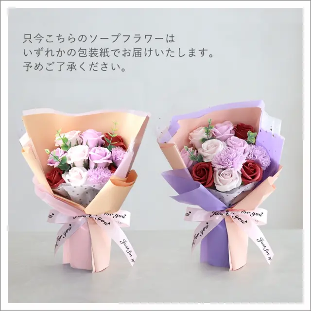 ソープフラワーはお相手の好みにあわせてお選びいただけます。メッセージを添えたバームで気持ちが伝わる贈り物になりますよ。