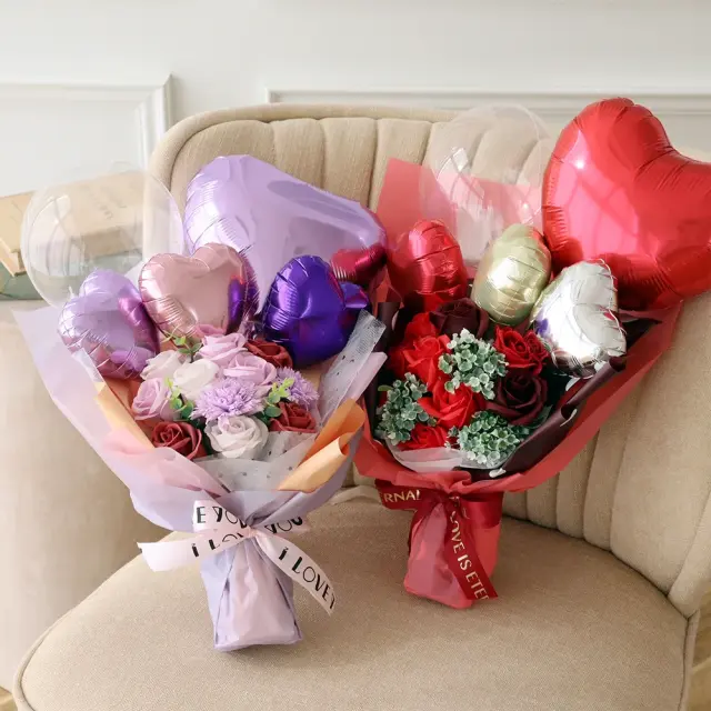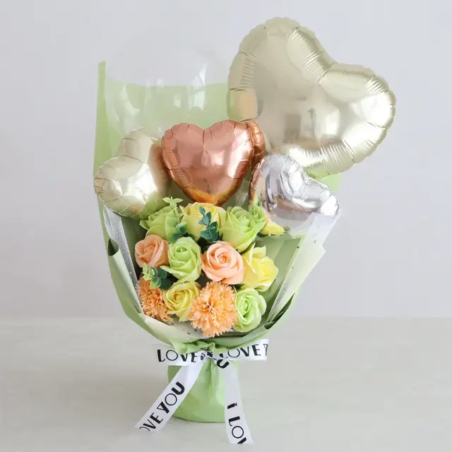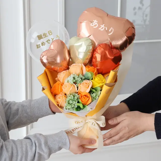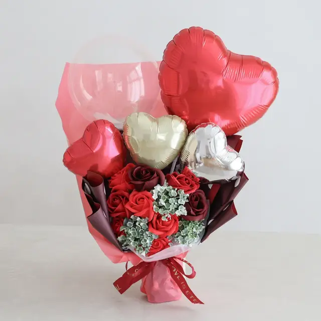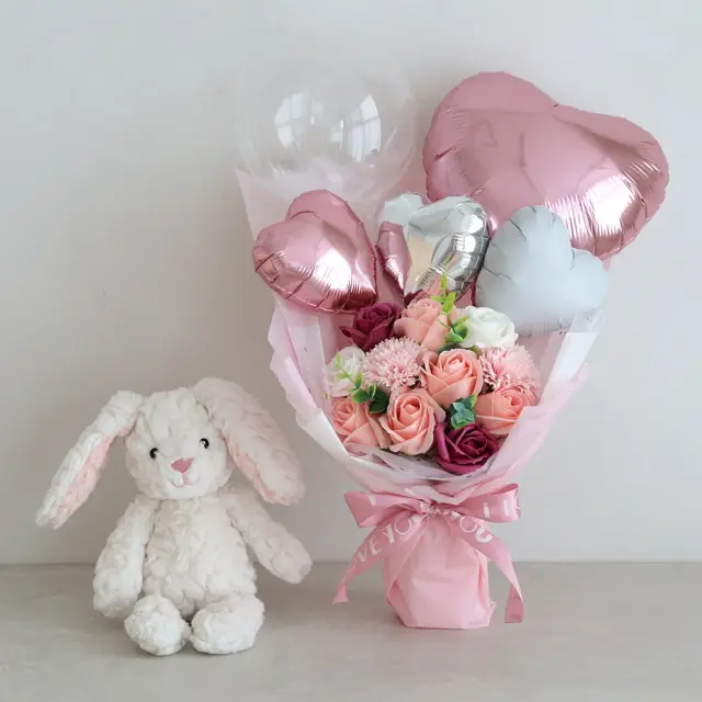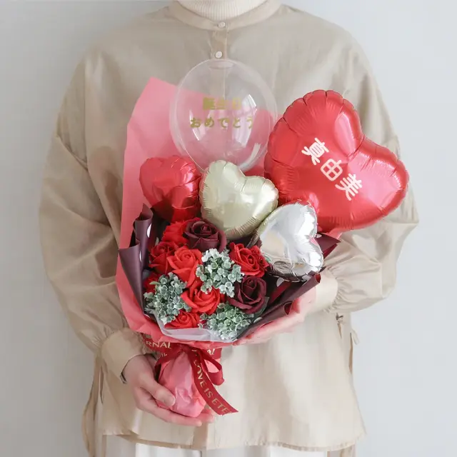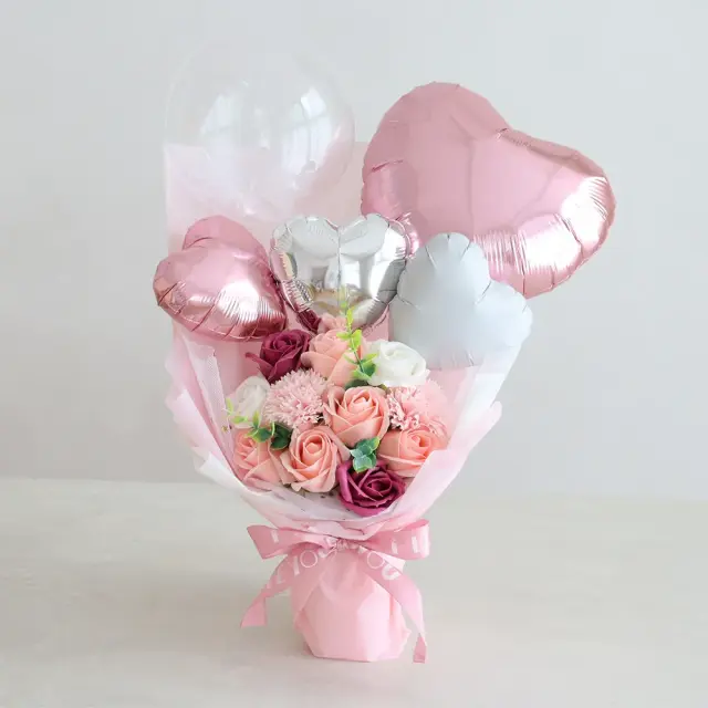 存在感抜群!ソープフラワーにバルーンをアレンジした華やかなブーケ。